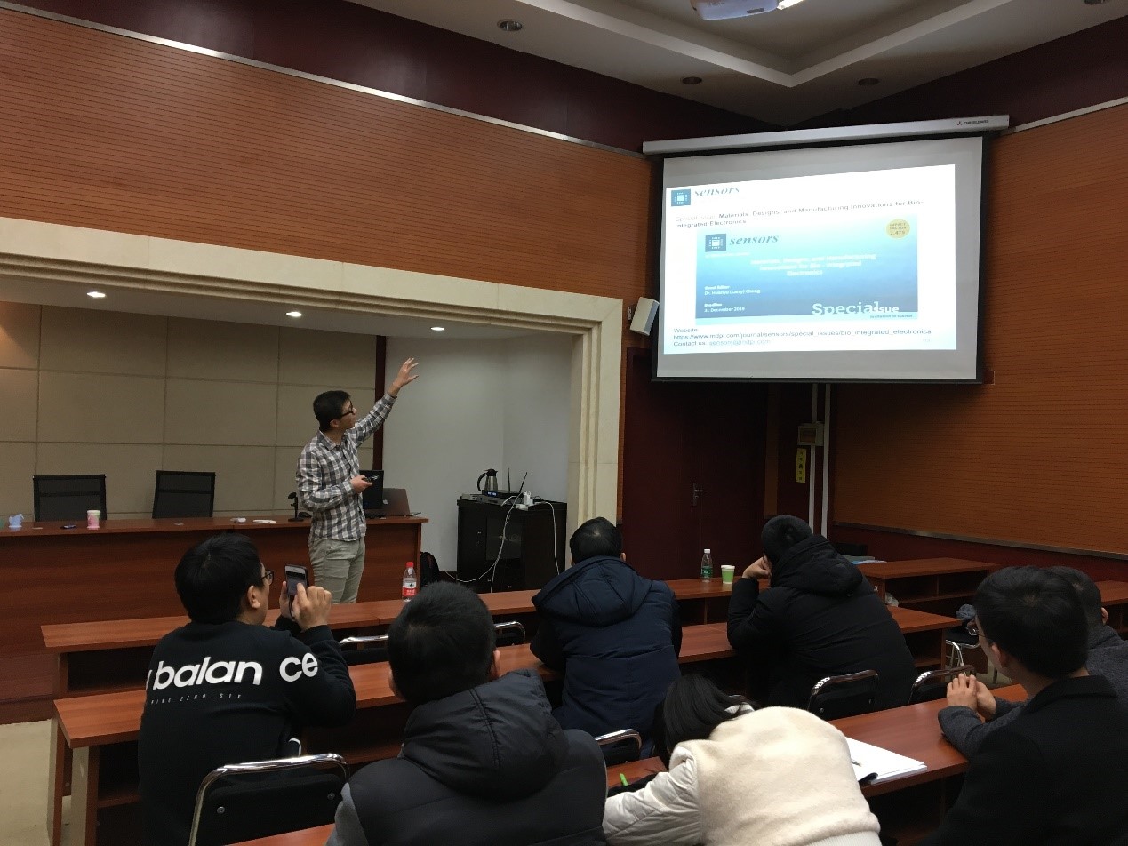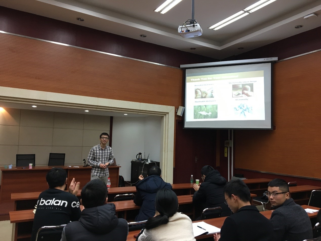 应亚博官网袁江宏副教授的邀请,2018年12月19日下午,美国宾夕法尼亚州立大学程寰宇博士来亚博官网进行学术交流,并作了题为“Dissolvable Tattoo Electronics for Biomedicine”的学术报告。程博士首先综述了柔性电子相关的前沿研究,包括先进转印技术、生物复合材料设计、多级微结构设计、三维组装等;接着重点介绍了可降解柔性电子的概念以及他近年来在可降解柔性电子方面的创新研究成果,包括可降解电子器件的力学设计及结构优化、可降解生物医疗传感技术、可降解集成电子等;最后对柔性电子尤其是可降解电子在人体健康监测及医疗等方面的潜在应用进行了展望。该报告引起了亚博官网师生的浓厚兴趣,现场气氛活跃、讨论热烈。报告结束后,亚博官网袁江宏老师与程寰宇博士就软材料与柔性结构设计等前沿课题进行了深入交流,并探讨了今后合作研究的可能性。程寰宇博士此行增进了亚博取款曝顾秒到账与国外知名高校之间的学术交流与合作,促进了亚博官网的科研发展。