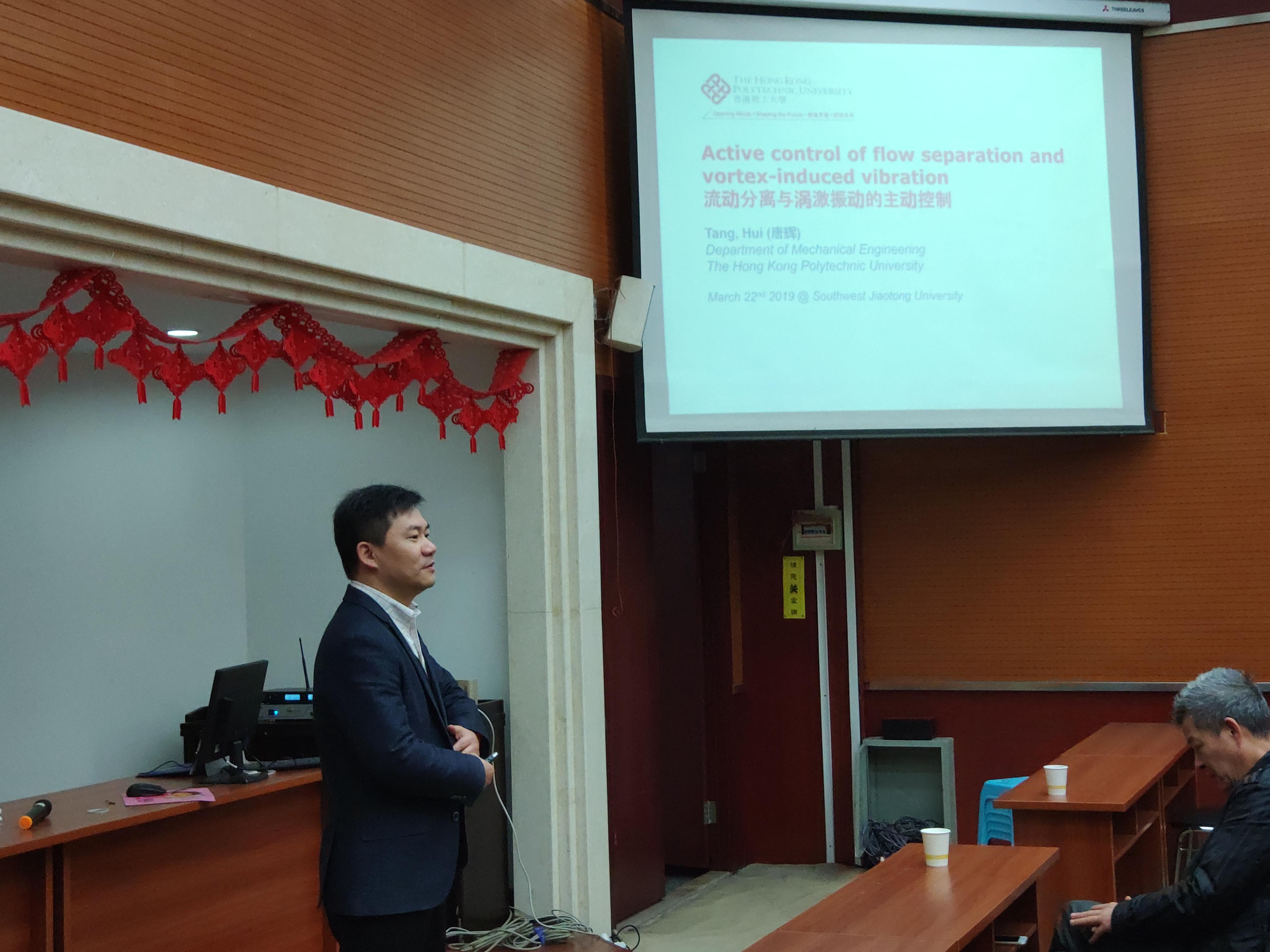 应力学与工程学院李鹏老师的邀请,香港理工大学唐辉副教授,于2019年3月22日在九里校区行政楼240会议室,进行了题为“Active Control of Flow Separation and Vortex-induced Vibration”的专题讲座,并与3月22日下午在振动中心参与流固耦合课题组的组会讨论。亚博官网研究生、博士生以及流固耦和相关方向导师参与了报告及交流。