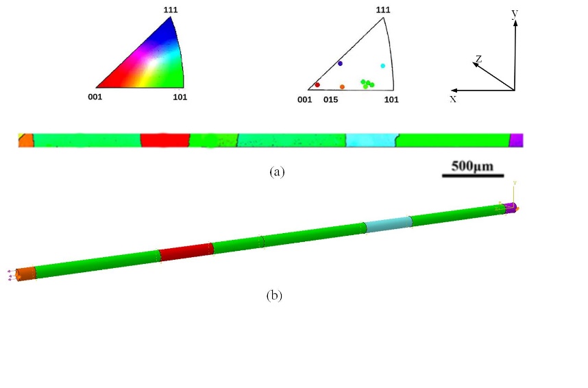 图1 竹状晶微丝的EBSD图片和有限元模型